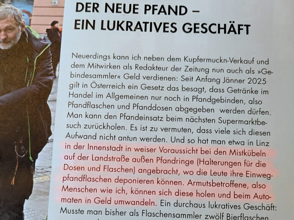 In der Kupfermuckn (Die oberösterreichische Straßenzeitung) ist dazu im Frühjahr 2025 ein Artikel über die Pfandeinführung erschienen – Johannes spricht von „weiser Voraussicht“ in Linz. Nun könnte die Aktion fortgeführt und die „Pfandring-Zone“ erweitert werden. Wo sind weitere Pfandflaschenrückgabe-Einrichtungen sinnvoll? Hinweise bitte über unser Kontakformular senden oder direkt per Mail an info@ahoi-linz.at.