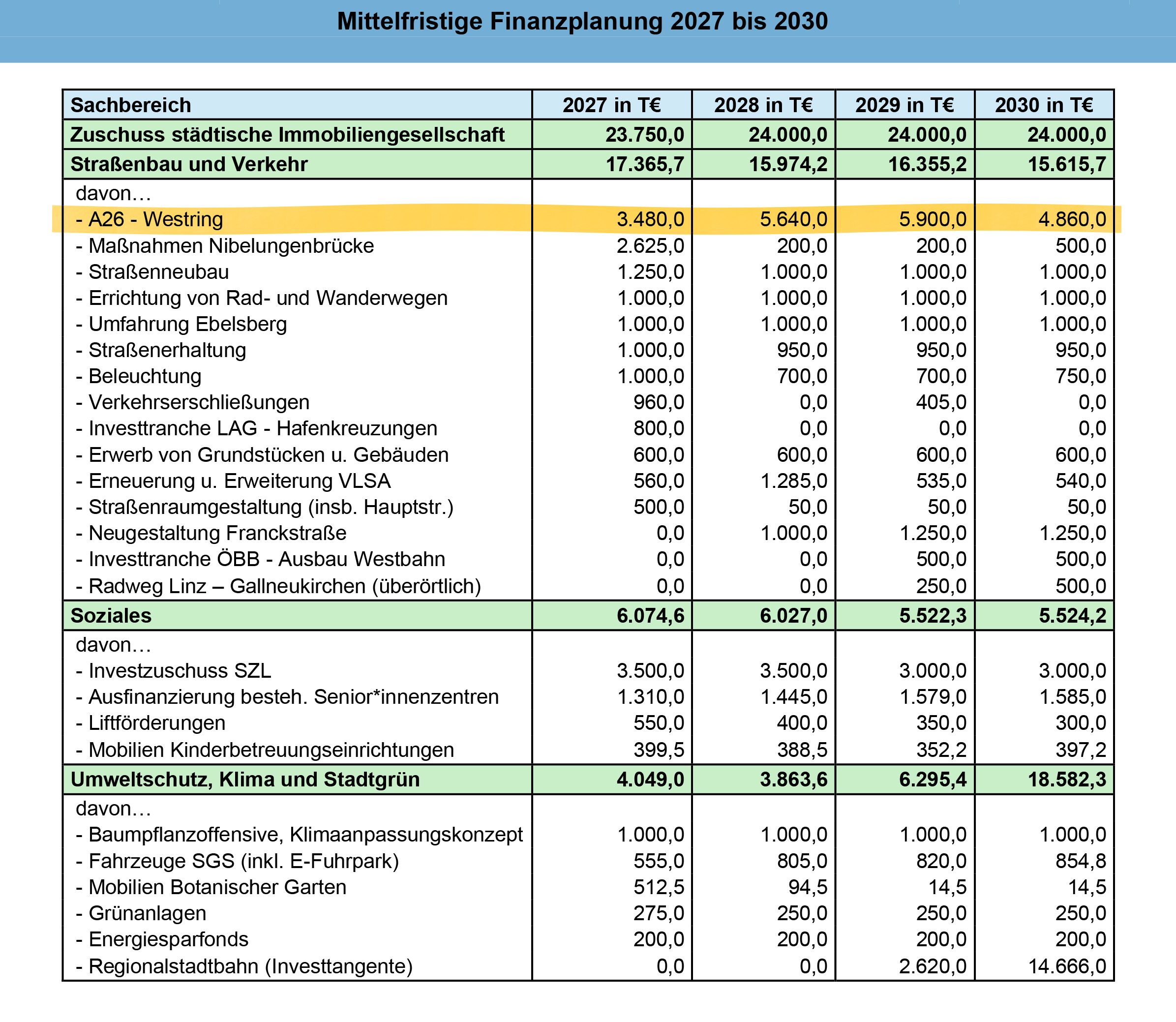 Obwohl die Stadt Linz bereits erhebliche Beiträge zur A26 geleistet hat, bleibt festzuhalten: Die Finanzierung von Autobahnen ist Aufgabe des Bundes und der ASFINAG – nicht der Stadt Linz als kommunale Gebietskörperschaft. Auch im Kontrollamtsbericht von 2023 wurde betont, dass Investitionen in Infrastruktur mit überregionalem Nutzen durch Bund und Land Oberösterreich getragen werden sollten.